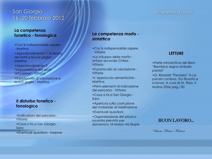 ecco il programma di lavoro del nostro ultimo seminario che si svolgerà a San Giorgio Ionico (TA) dal 16 al 20 febbraio 2012